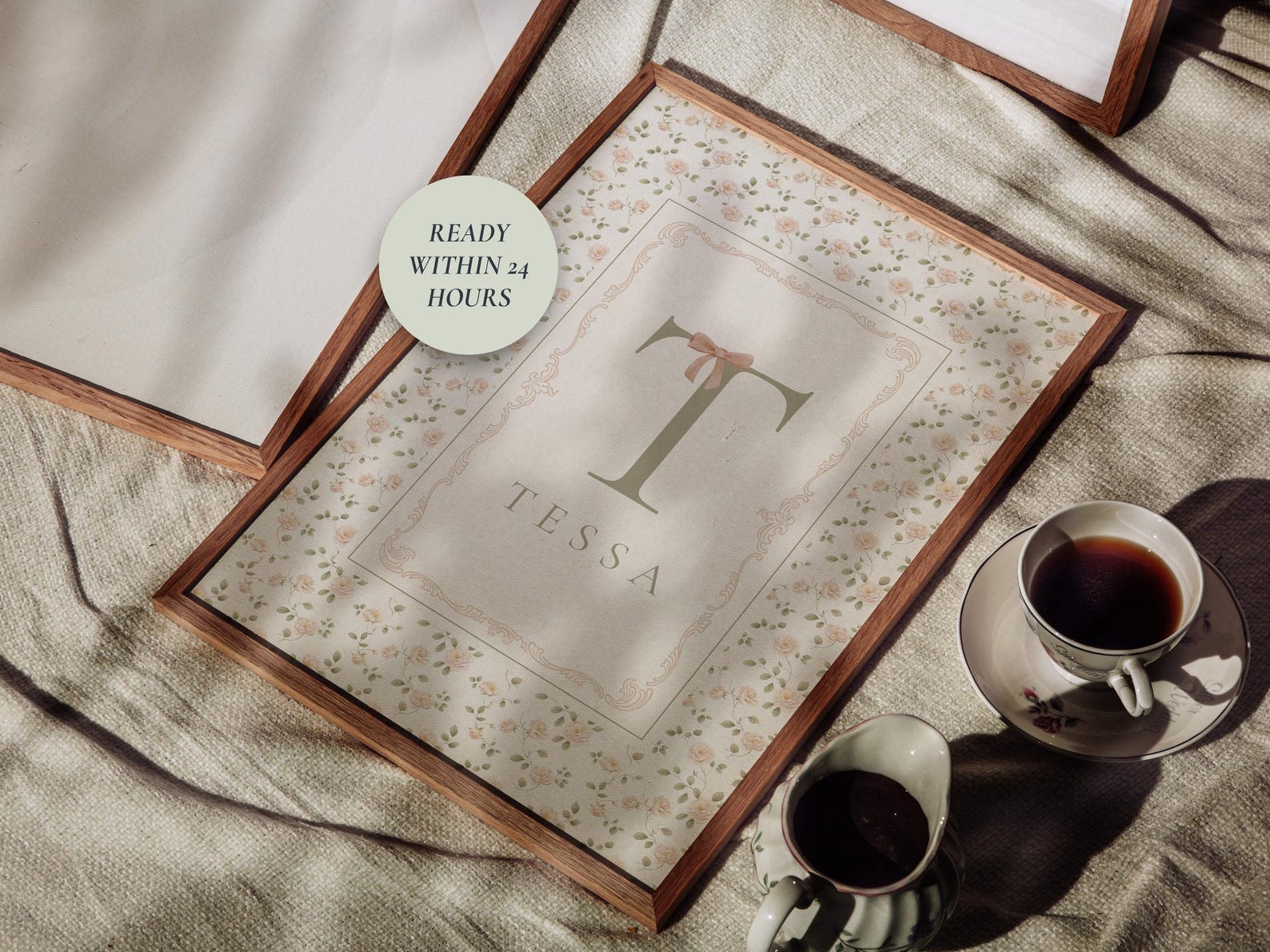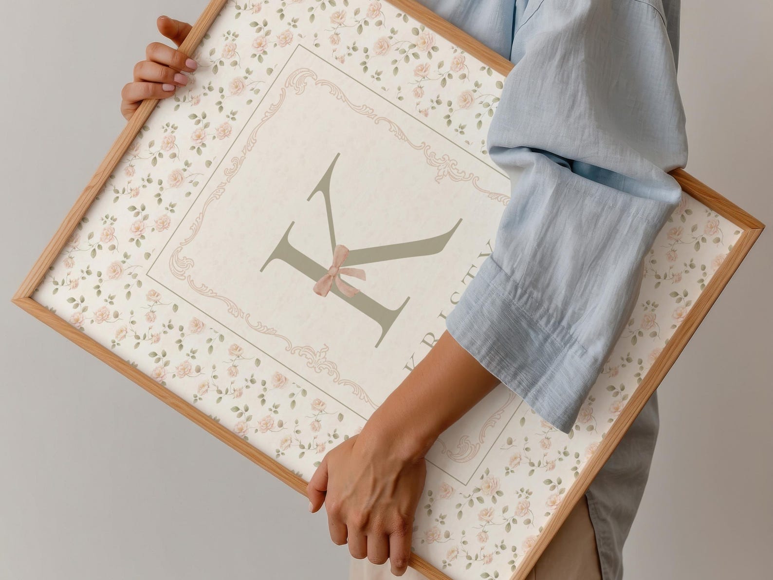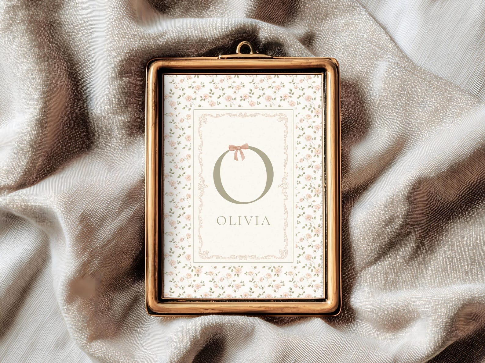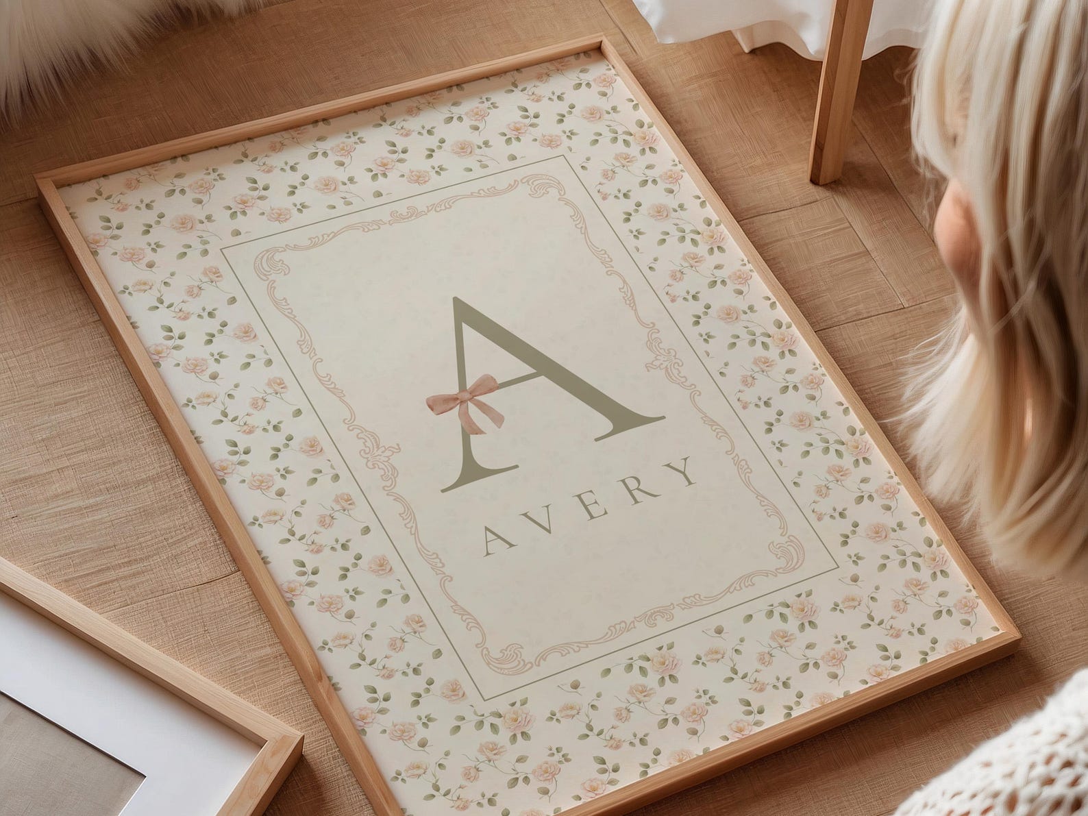 A timeless digital personalized nursery wall art print featuring a floral background and a detailed frame featuring the initial and name of a little girl. Perfect for a nursery, kids’ room, or as a birth, baby shower or birthday gift. This digital download (ready within 24 hours) lets you print and frame it your way; at home or at your favorite print shop or digital printing service.
